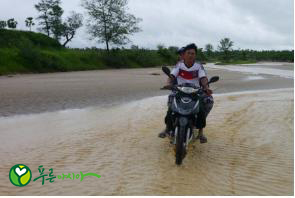 마그웨이주 낫마욱 읍의 메잘리빈 마을은 타운십인 낫마욱에서 40여분 떨어져 있는 작은 마을이랍니다. 지금 같은 우기에 폭우가 쏟아지면 도로가 끊겨, 타운십에서 학교 다니고 있는 아이들이 집에 올 수도 없고 주민들이 타운십으로 나갈 수도 없는 상황이 되는데 지부 활동가들은 이 폭우를 뚫고 용감무쌍하게 메잘리빈 마을을 방문했답니다.(차가 다닐수 없어 주민들이 오토바이로 픽업을 나왔다는….)