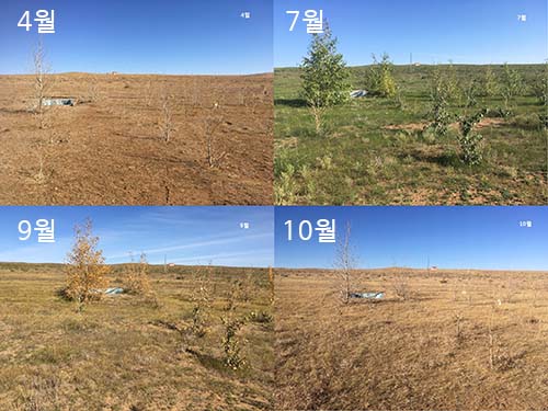 조림사업이 마무리되고 난 뒤 나무들은 처음 마주했을 때의 모습으로 돌아갔다. 문득 4월 눈 덮인 조림지에서 나무를 처음 봤을 때 생각과 느낌이 떠올랐다. ‘으스스하고 황량하다. 나무는 어디 있는 거지? 오……, 이 얇은 게 나무구나. 와, 신기하다.’등등 일반적으로 생각했던 풍경과 너무 달라 놀랐던 게 한두 가지가 아니었다. 그렇게 새롭고 다채로운 풍경들과 함께 하다 보니 7개월이라는 시간이 금방 지나갔다. 나무들과 몇 달을 같이 보내며 나무들의 일과를 알고 나니 지금의 풍경이 다르게 다가온다. 분명 4월과 매우 비슷한 모습인데 황량함보다는 ‘고요한 쉼’이 느껴진다. 알다시피 몽골의 자연은 그리 호락호락하지 않다. 매서운 모래바람과 무럭무럭 자라기에는 턱없이 부족한 강수량, 무엇이든 말려버리는 건조한 기후……, 이런 자연 상황에서도 나무들은 묵묵히 잎 틔우는 봄, 푸르른 여름, 황금빛 가을을 일궈나갔다. 모든 과정들을 함께 지내고 나니 잎을 떨어뜨리고 가지만 남은 그 모습이 그렇게 평온해 보일 수가 없다.