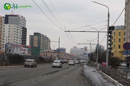 (울란바토르의 거리인데 왼쪽에 푸른아시아 몽골지부가 있는 건물도 보인다.)