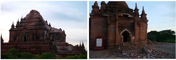 지진으로 파손된 800년 전통의 술라마니 파고다(좌) 와 이름 없는 작은 파고다(우)