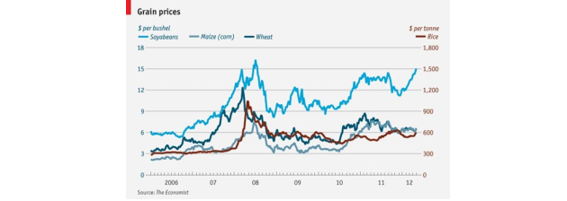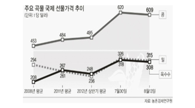 <표 2. The Economist online, 국제 곡물가격 추이 2012년 5월 1일>??