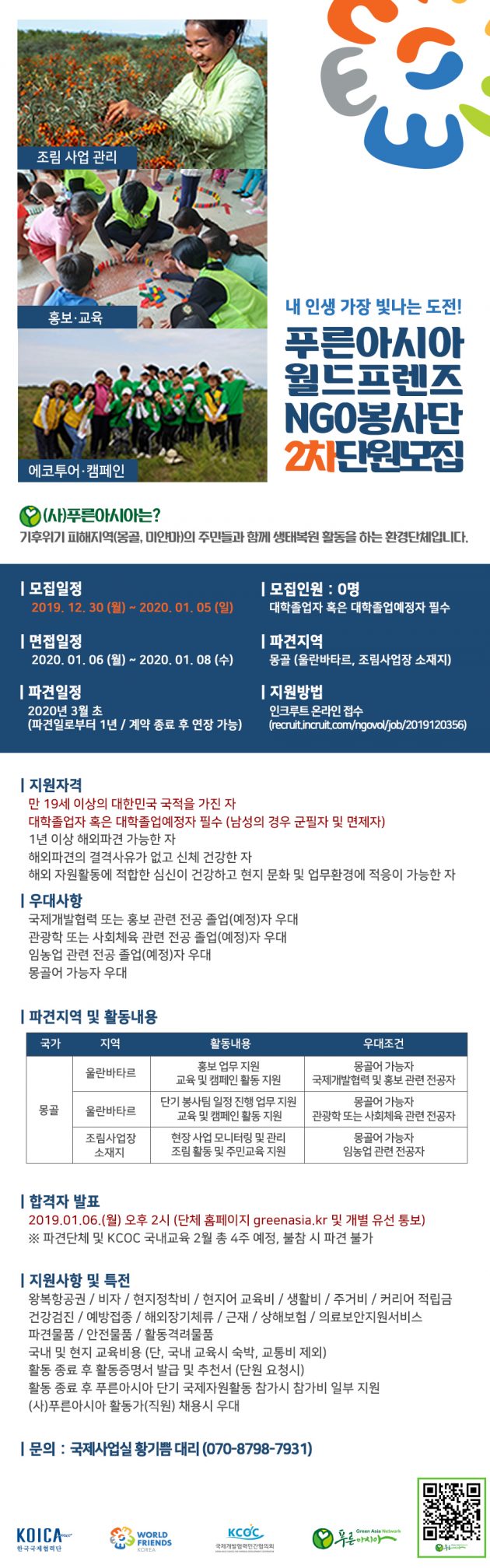 (사)푸른아시아에서 2020년도 월드프렌즈 NGO봉사단 단원 2차 모집을 진행합니다!