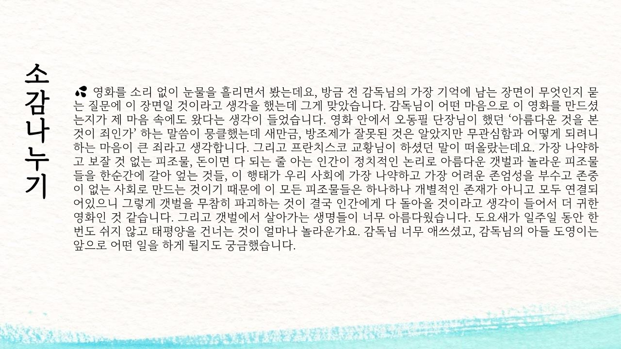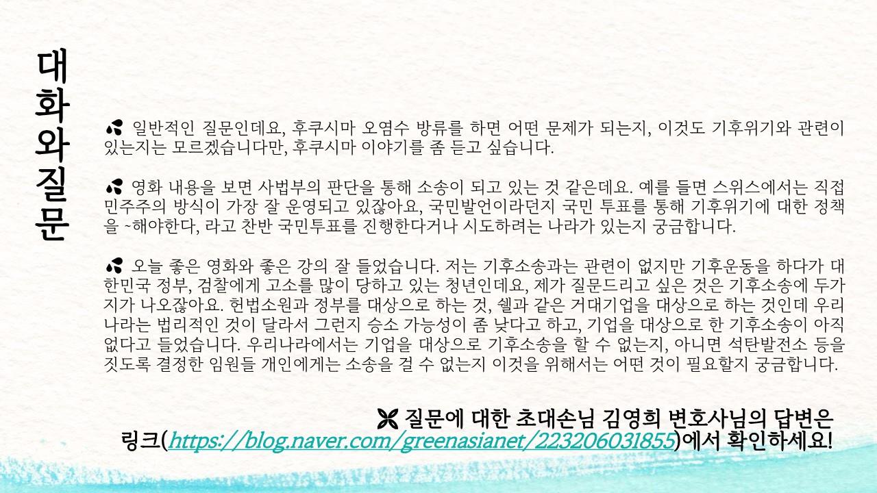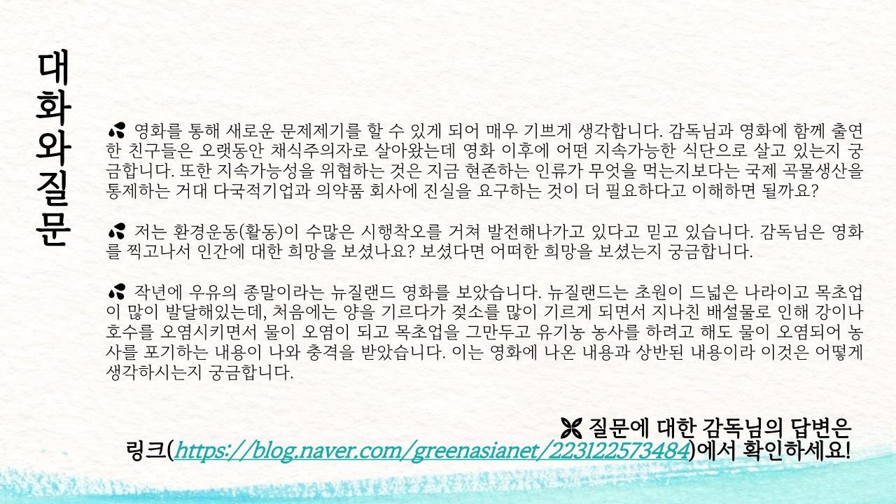 영화 상영회에 대한 소식을 받고 싶다면 greenasia@greenasia.kr로 문의하세요. :)