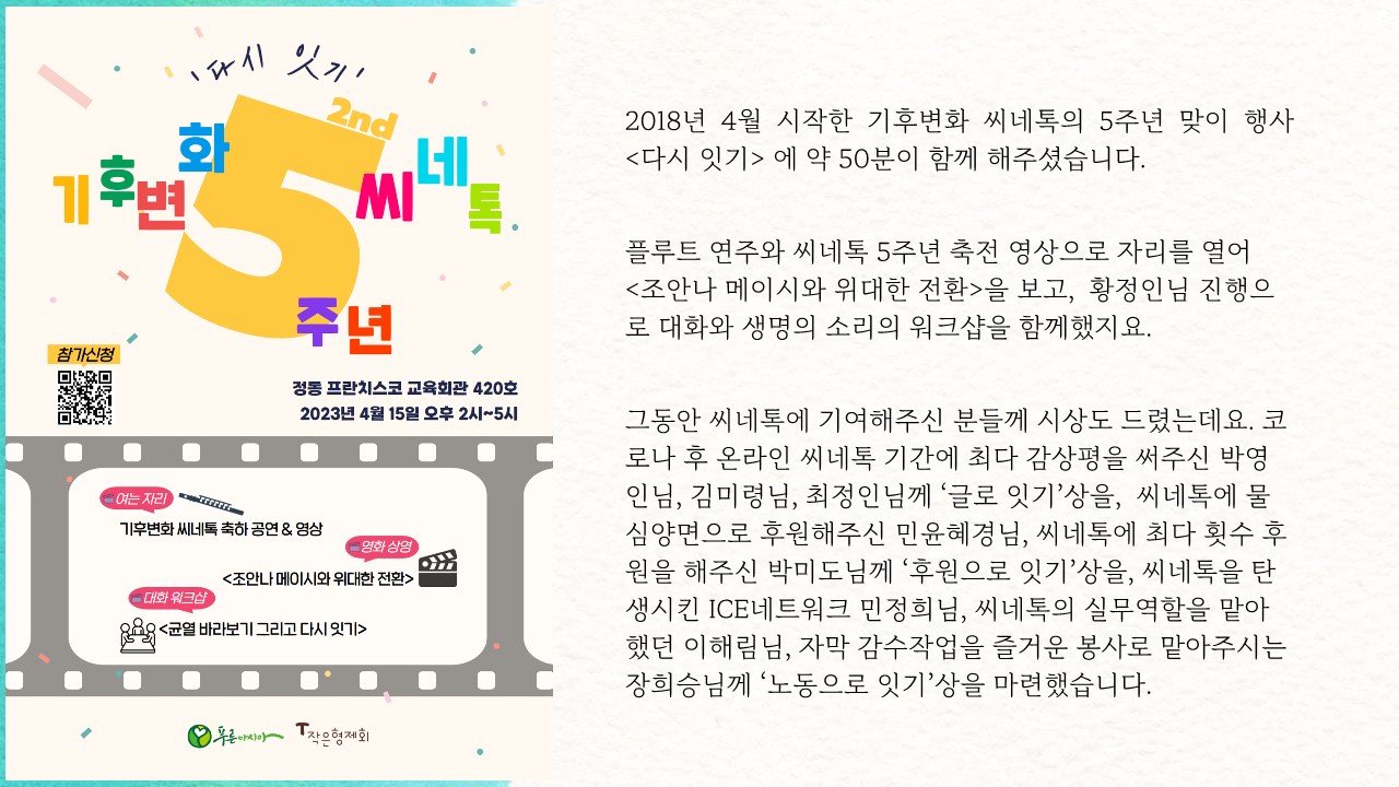 2018년 4월 시작했던 기후변화씨네톡이 어느덧 만 5년을 넘겼습니다.