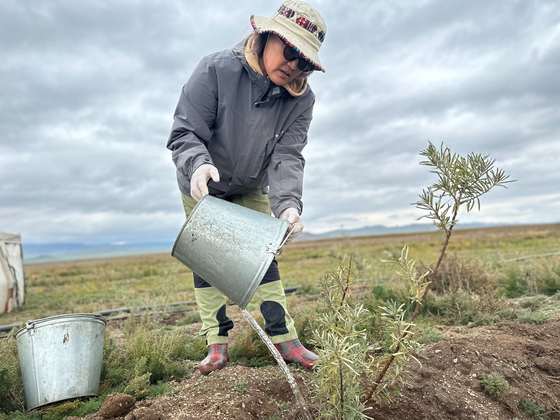 몽골 바양항가이에 조성된 상생의 숲에서 주민이 나무에 물을 주고 있다. 천권필 기자